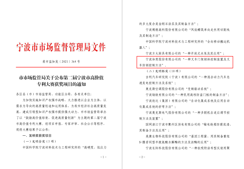 寧波如意發明專利項目:《一種叉車門架傾斜控制裝置及叉車防傾控制方法》在寧波市高價值發明專利大賽中榮獲“高價值發明專利金獎”,寧波市共五個金獎項目,寧海縣唯一一個金獎項目。發明人:傅敏,葉青云,葉國云。